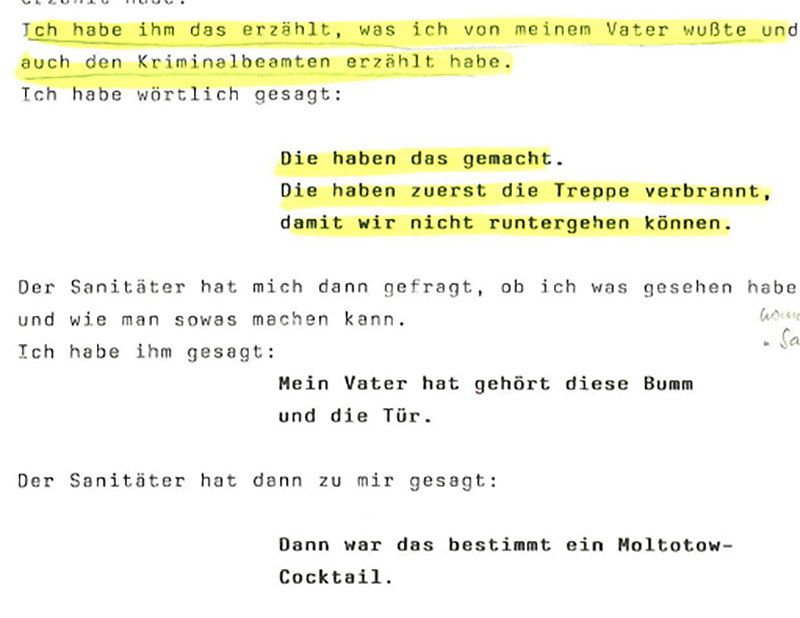 Safwan E. hat in der polizeilichen Befragung eine plausible Erklärung für die Aussage des Sanitäters: Direkt nach seiner Rettung hat er mehreren Personen von der Beobachtung seines Vaters erzählt, der gehört hatte, wie das Gartentor quietscht und es danach knallt. Beim Blick aus dem Fenster hatte er Feuerschein aus dem Vorbau des Hauses gesehen. „Die haben das gemacht“, gibt Safwan E. die Vermutung seines Vaters weiter. Mit „die“ hatte sein Vater Neonazis gemeint.