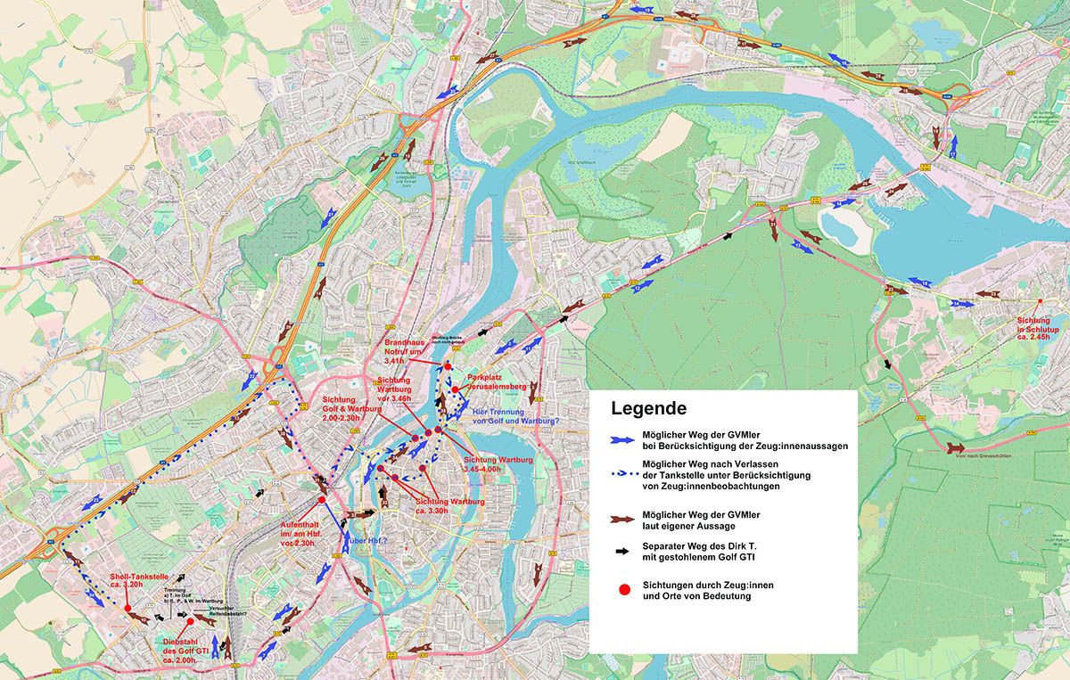 Rekonstruktion mutmaßlicher Aufenthaltsorte der vier Neonazis aus Grevesmühlen in der Brandnacht