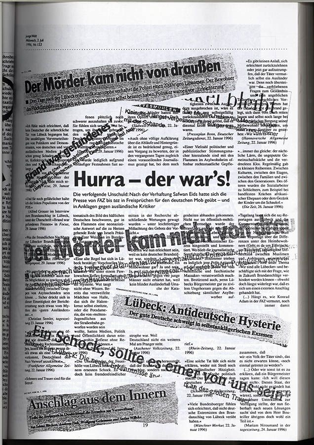 aus: WIE OPFER ZU TÄTERN GEMACHT WERDEN: Fakten und Material zur Aufklärung über den Brandanschlag in Lübeck, Projektgruppe Antinazismus der IG Medien, 1996