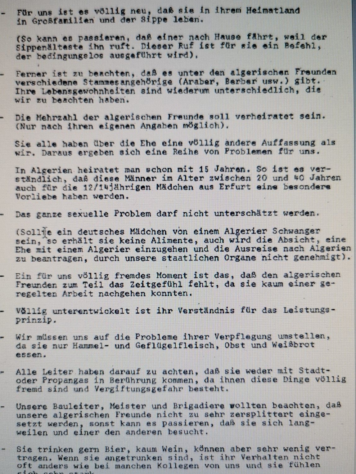 Anbei ein Auszug aus einer dreiseitigen Liste „zu einigen Besonderheiten und Lebensgewohnheiten der algerischen Freunde“, die „einer schriftlichen Argumentation zum Einsatz von Werktätigen aus der Demokratischen Volksrepublik Algerien im VE Bau- und Reparaturkombinat Erfurt“ entstammen.