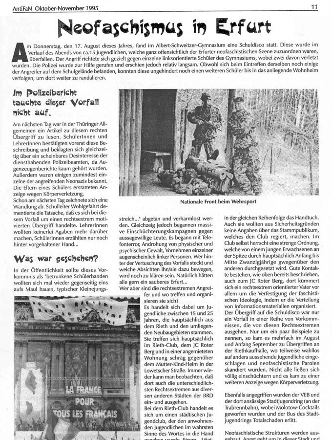 Am 26. Mai 1991 schlägt ein Skinhead in der Nähe von Erfurt einem sowjetischen Staatsangehörigen mit einem Baseballschläger so auf den Kopf, dass dieser einen Schädelbasisbruch erleidet. Am 19. August 1992 werden zwei Algerier in einer Erfurter Gaststätte angegriffen. Die Liste rechter Gewalttaten in Erfurt und Umgebung ist lang und reißt auch in den folgenden Jahren nicht ab.