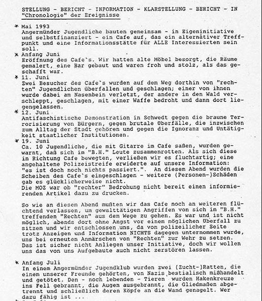 Chronik der Angriffe, erstes Halbjahr 1993 in Angermünde, Archiv INWOLE