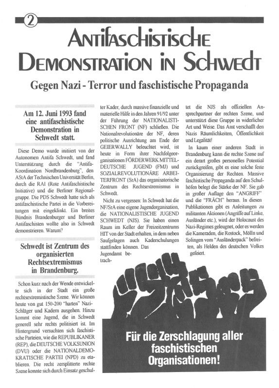 Ein Bündnis von Antifa-Gruppen aus der Uckermark und Berlin ruft im Juni 1993 zu einer Demonstration in Schwedt auf. Etwa 400 Menschen folgen dem Appell und demonstrieren »Gegen faschistischen Terror und Neonazi-Propaganda! Gegen den braunen Gürtel um Berlin!«.