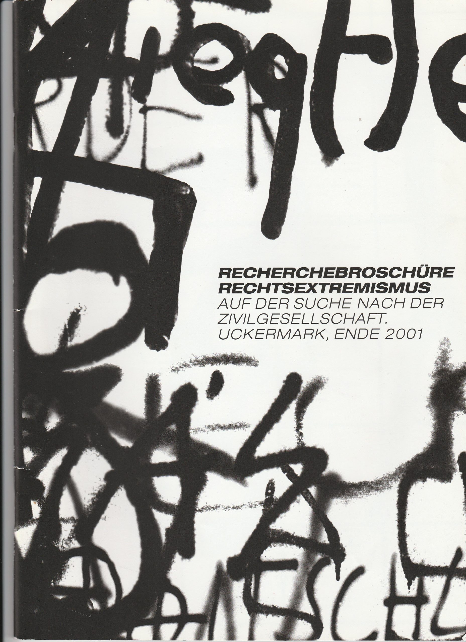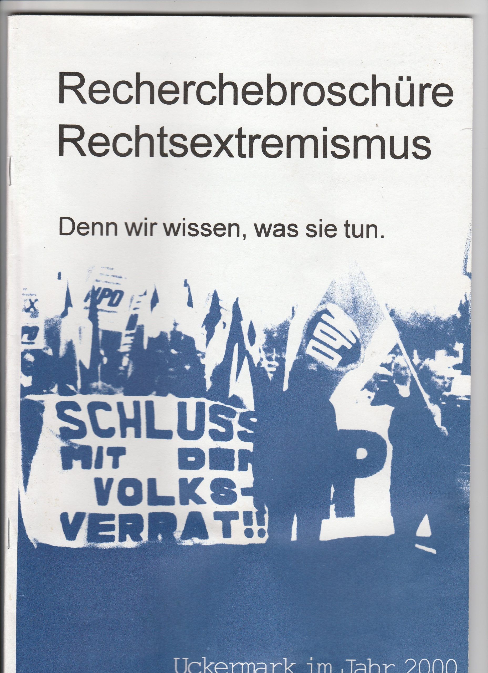 Mit einer Broschüre über Rechtextremismus in der Uckermark veröffentlicht ein Autor*innenkollektiv aus dem Infocafé Angermünde im Jahr 2000 eine umfangreiche Recherche über rechtsextreme Strukturen. Rechte und rassistische Angriffe werden systematisch in einer Chronik erfasst. Es gibt Beiträge über die Bedeutung faschistischer Symbolik für die Jugendszene in der Uckermark und Hintergründe über Neonazi-Parteien wie die NPD. Bethi Ngari beschreibt in einem Text die Situation Geflüchteter.