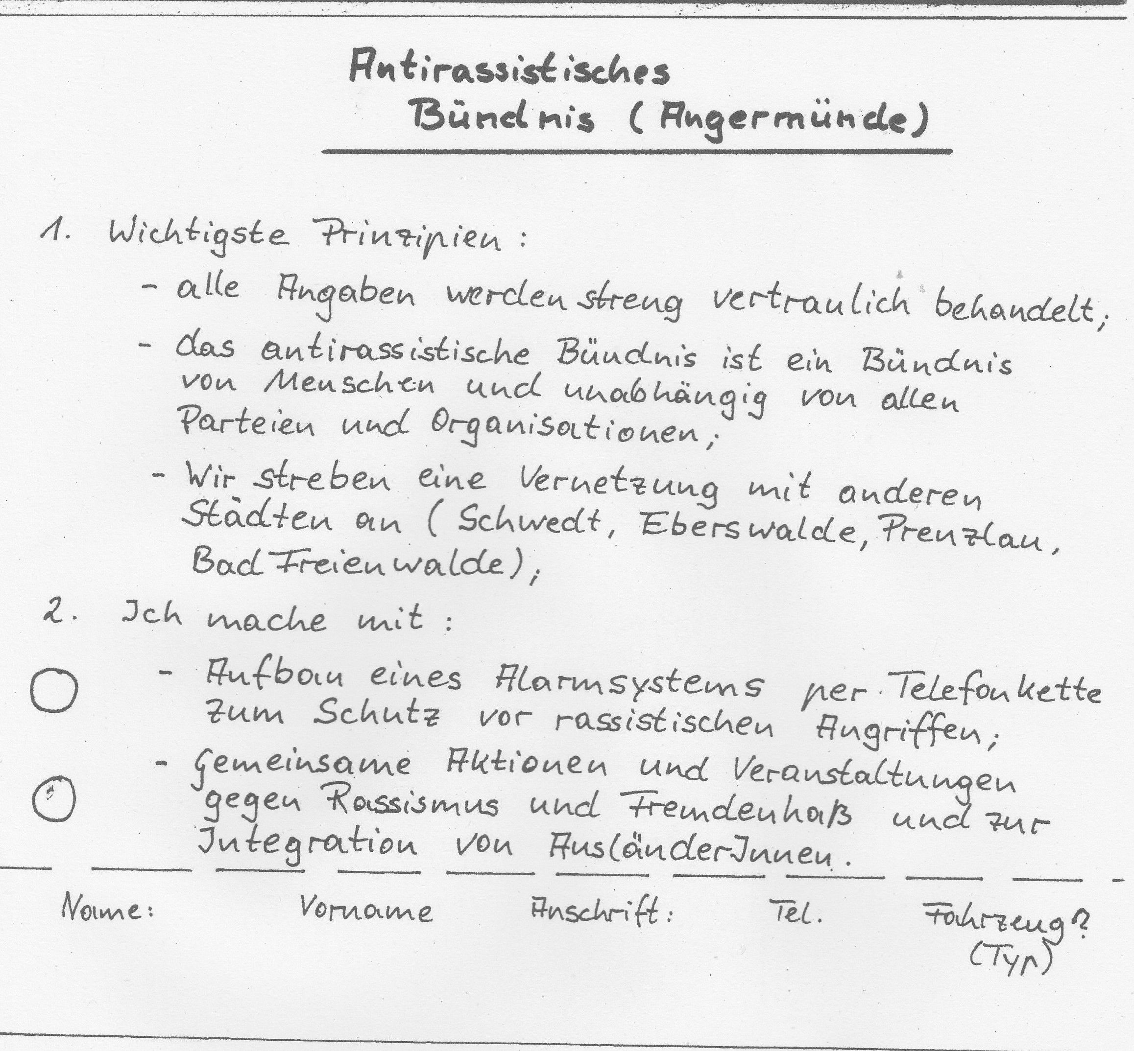 Um dem rassistischen Grundkonsens und der Gleichgültigkeit etwas entgegenzusetzen, entstehen an vielen Orten antirassistische Bündnisse. Als Konsequenz aus den Erfahrungen der Schutzlosigkeit ist das Vertrauen in Polizei und Justiz gering. Deshalb organisieren viele Gruppen ein eigenes Netzwerk und Telefonketten, die bei einem rassistischen Angriff aktiviert werden können. Erstmals entstehen auch bürgerliche Bündnisse gegen rechts, teilweise unter Beteiligung von Vertreter*innen aus Politik und Verwaltung. In Angermünde gründet sich Ende 1998 das „Bündnis für eine weltoffene, tolerante und gewaltfreie Stadt“.