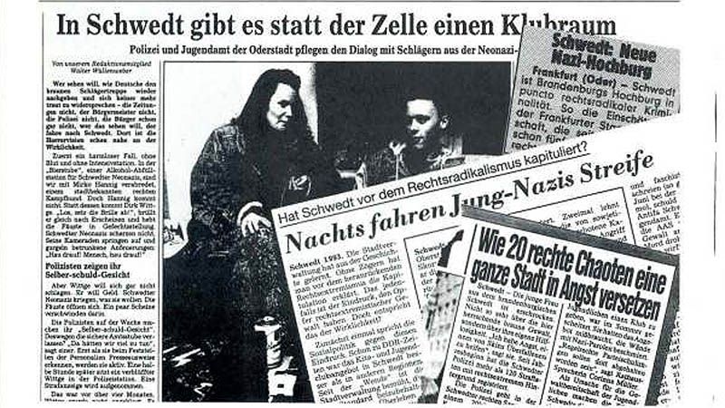 1993 gerät das nur 20 km von Angermünde entfernte Schwedt/Oder international in die Schlagzeilen. Schon kurz nach der Wende fassen rechtsextreme Parteien wie die Republikaner (REP) und die „Deutsche Volksunion“ hier Fuß. Auch die in Westdeutschland gegründete „Nationalistische Front“ (NF) ist in Schwedt aktiv. Die 1992 wegen ihrer offen rechtsterroristischen Strukturen verbotene NF arbeitet gezielt am Aufbau einer militanten Neonazi-Bewegung in Ostdeutschland. Nach dem Verbot bleiben die NF-Kader in Schwedt weiter aktiv und nennen sich nun SrA (Sozialrevolutionäre Arbeiterfront). Die Stadt entwickelt sich in dieser Zeit zu einer Hochburg der extremen Rechten mit mehreren Hundert Aktivist*innen und wird zur Angstzone für alle, die sich nicht der Vormachtstellung der Neonazis unterwerfen wollen.